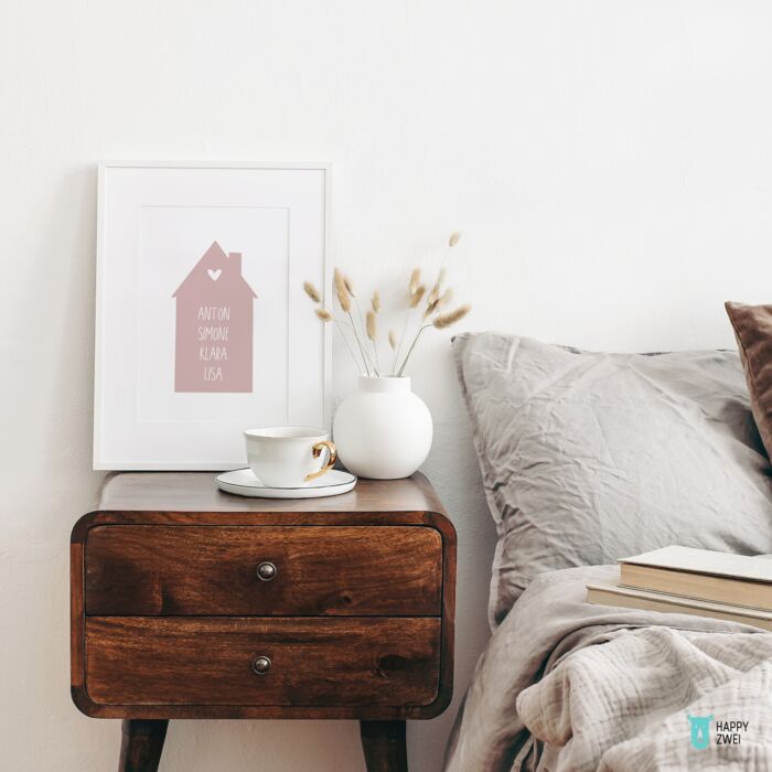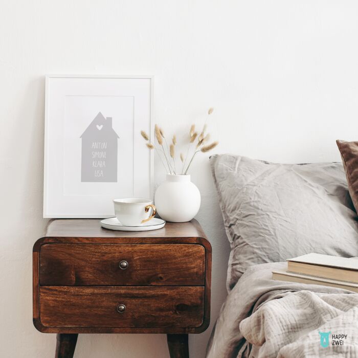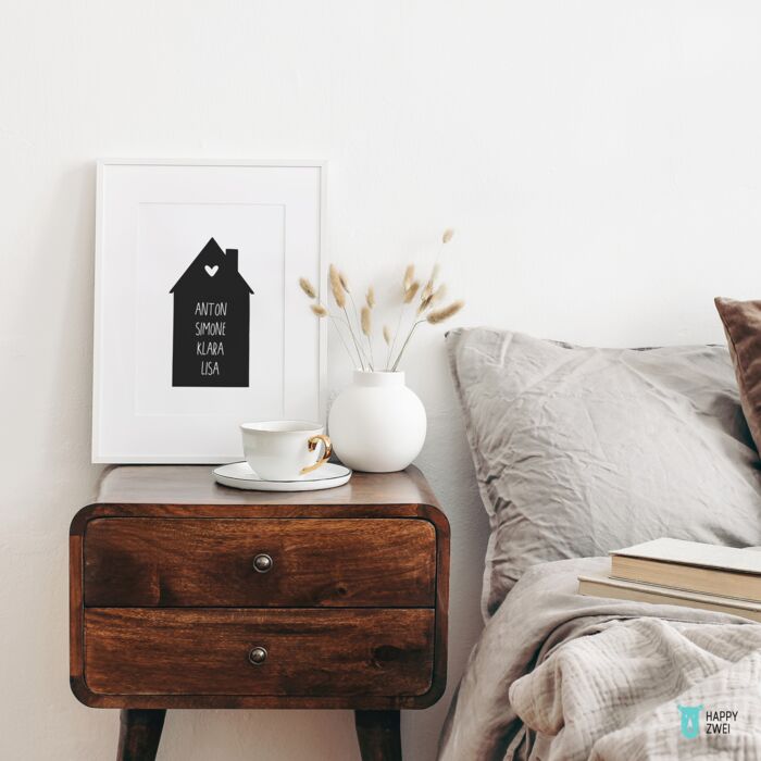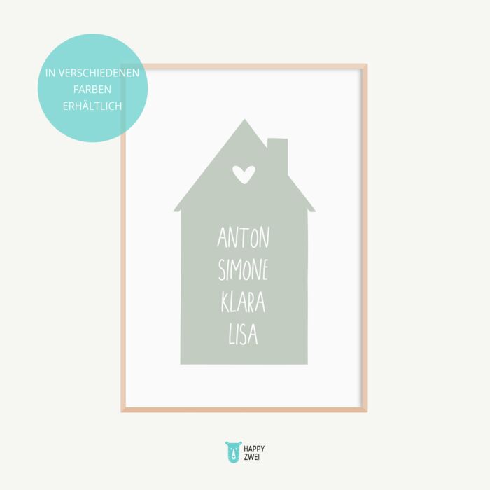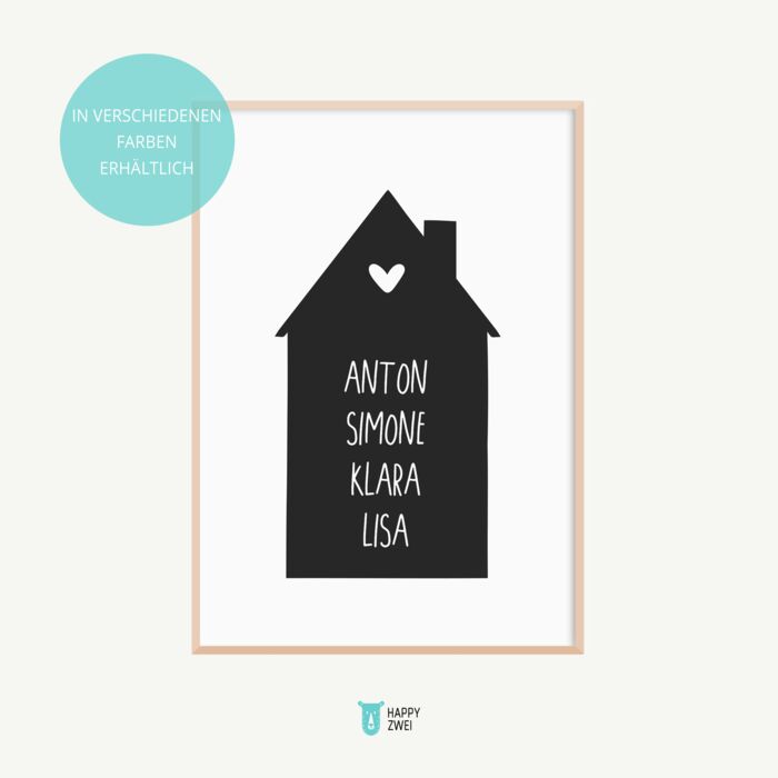 Personalisiertes Poster mit Haus-Motiv und den Vornamen aller Familienmitglieder. Haustiere mit Pfoten-Icon sind natürlich auch möglich. :)