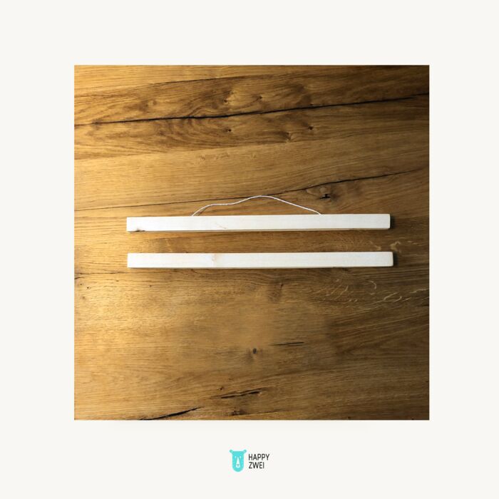 Zwischen den Holzleisten befinden sich Magnete. Das Poster kann einfach dazwischen eingeklemmt werden. An der oberen Leiste befindet sich eine Schnur, welche als Aufhängung dient.
