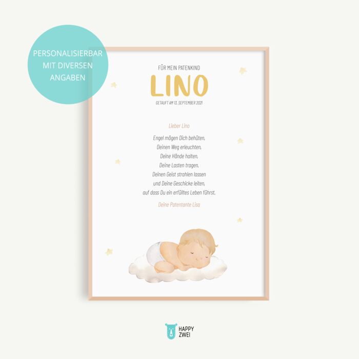 Der Brief wird komplett nach deinen Wünschen angepasst, das heisst, Taufspruch, Taufdatum, Name, Farbe des Namen, sowie das Baby können angepasst werden. Einige Vorschläge für das Baby findest du in der Bildergalerie. Deine Personalisierungswünsche kannst du einfach in das entsprechende Feld schreiben.
